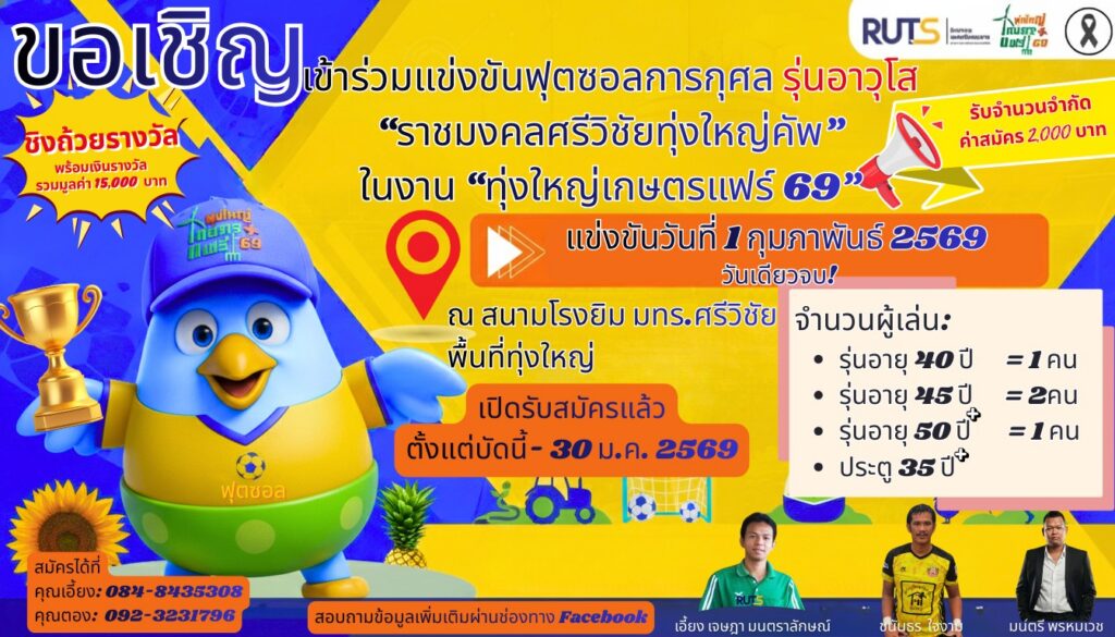 รับสมัครทีมฟุตซอลเข้าร่วมแข่งขัน ฟุตซอลรุ่นอาวุโส “ราชมงคลศรีวิชัยทุ่งใหญ่คัพ”