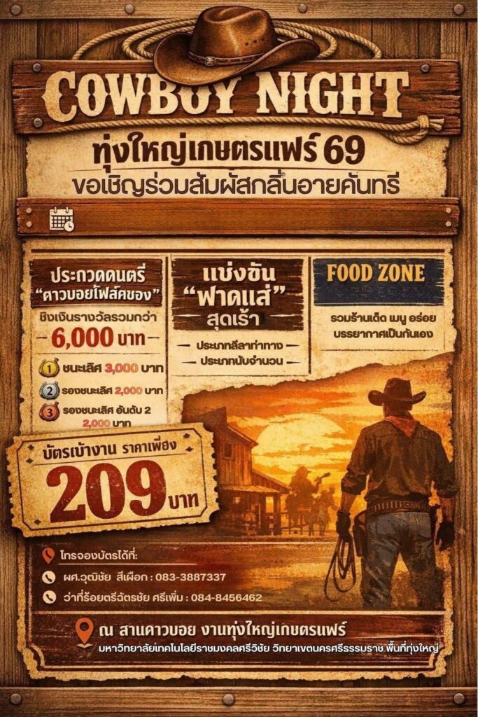 ขอเชิญร่วมสัมผัสกลิ่นอายคันทรี่ กิจกรรม COWBOY NIGHT ทุ่งใหญ่เกษตรแฟร์ 69 วันที่ 9 กุมภาพันธ์ 2569